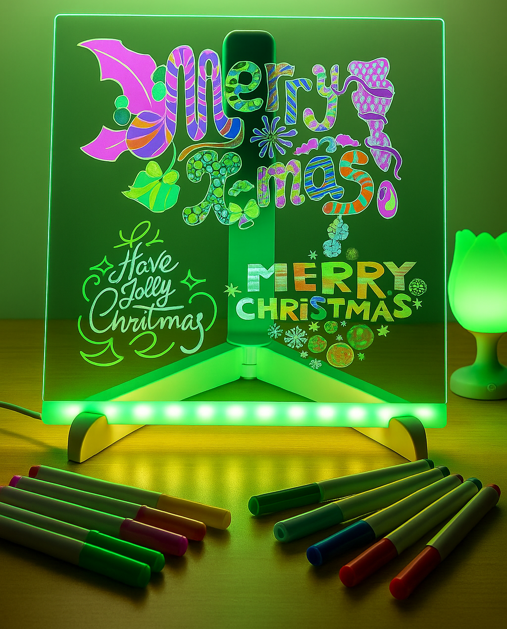 This LED acrylic writing pad lets your creativity shine. Perfect for kids and festive fun—just draw, write, wipe, and repeat. Comes with colorful markers and a glowing green light for extra magic!