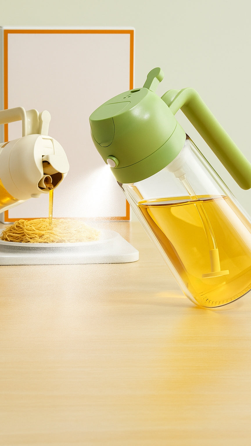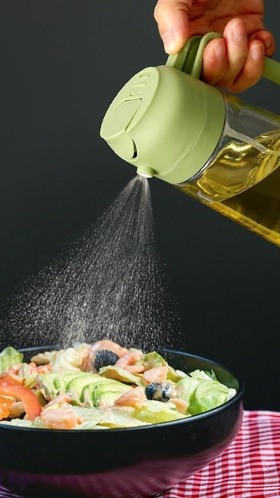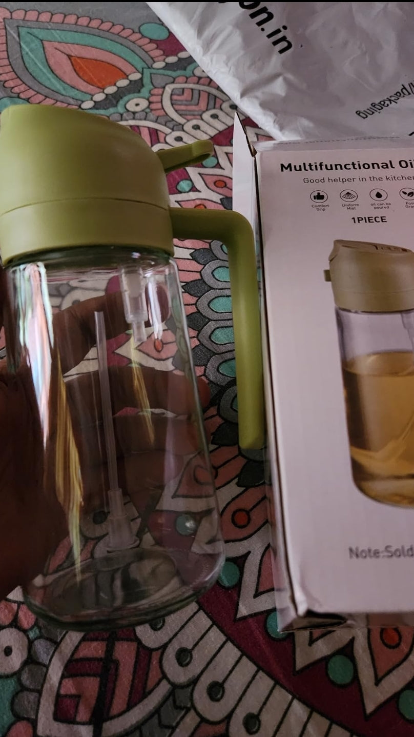 2 in 1 Oil Dispenser and Oil Sprayer - The press spray design makes it easier to control the amount of oil when using and reduces the absorption of grease for a healthier life. The spacious bottle mouth does not require a funnel. Reliable Material - The oil bottle is made of quality glass and food grade material. The transparent design allows the cook to easily see the state and amount of oil and quickly identify seasoning Multifunction Oil Sprayer Bottle - To meet a variety of cooking needs. This oil sprayer can add various condiments, such as olive oil, soy sauce ,vinegar, lemon, cooking wine, water, etc. Perfect for cooking, baking, air fryer, roasting, salad, etc. It is a great and indispensable helper in the kitchen. Also can be used to clean the furniture and water plantsThoughtful Design - Our oil sprayer has an ergonomic handle that provides a comfortable grip and makes it easier to use. Keep the spray at a 45 degree angle to make the spray even. Glass bottles can be cleaned with a dishwasher.Not Dirty Hands design : Olive oil spray bottle is designed to be leak-proof, and the front-facing, prominent nozzle and the rear comfortable handle design enables users to achieve a fine, uniform, pure mist, users can pour or spray oil without getting their hands dirty, ensuring a clean and mess-free oil pouring or spraying experiment.